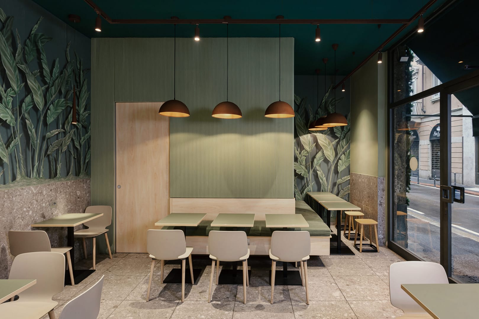 Un’attenta ricerca di materiali, colori e forme in perfettamente in armonia tra di loro e con il contesto che ospita questo bistrot.